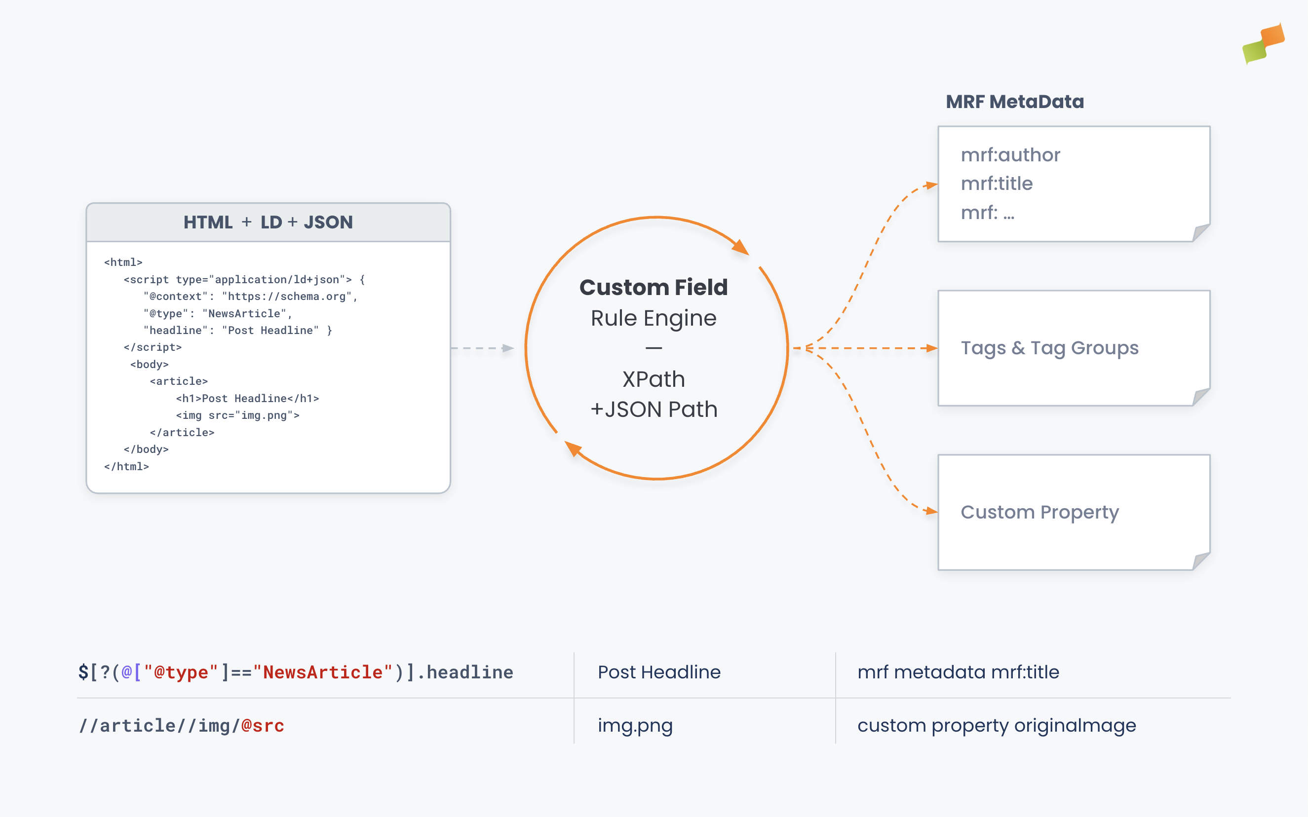 application/ld+jsonstructured data. If it exists in your server-rendered HTML, Custom Fields captures it. - Choose where to store it. Save extracted values as custom properties, tags, or MRF Metadata. Control what happens when a value already exists: overwrite, fill only if empty, or append.