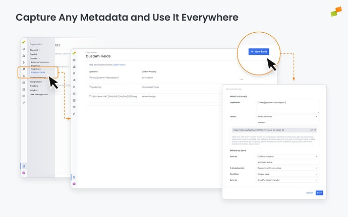Extract custom metadata from your articles during crawling and use it across Amplify, Recommender, and editorial workflows. Define what to capture, where to store it, and how it syncs — it automatically flows through your entire publishing stack.