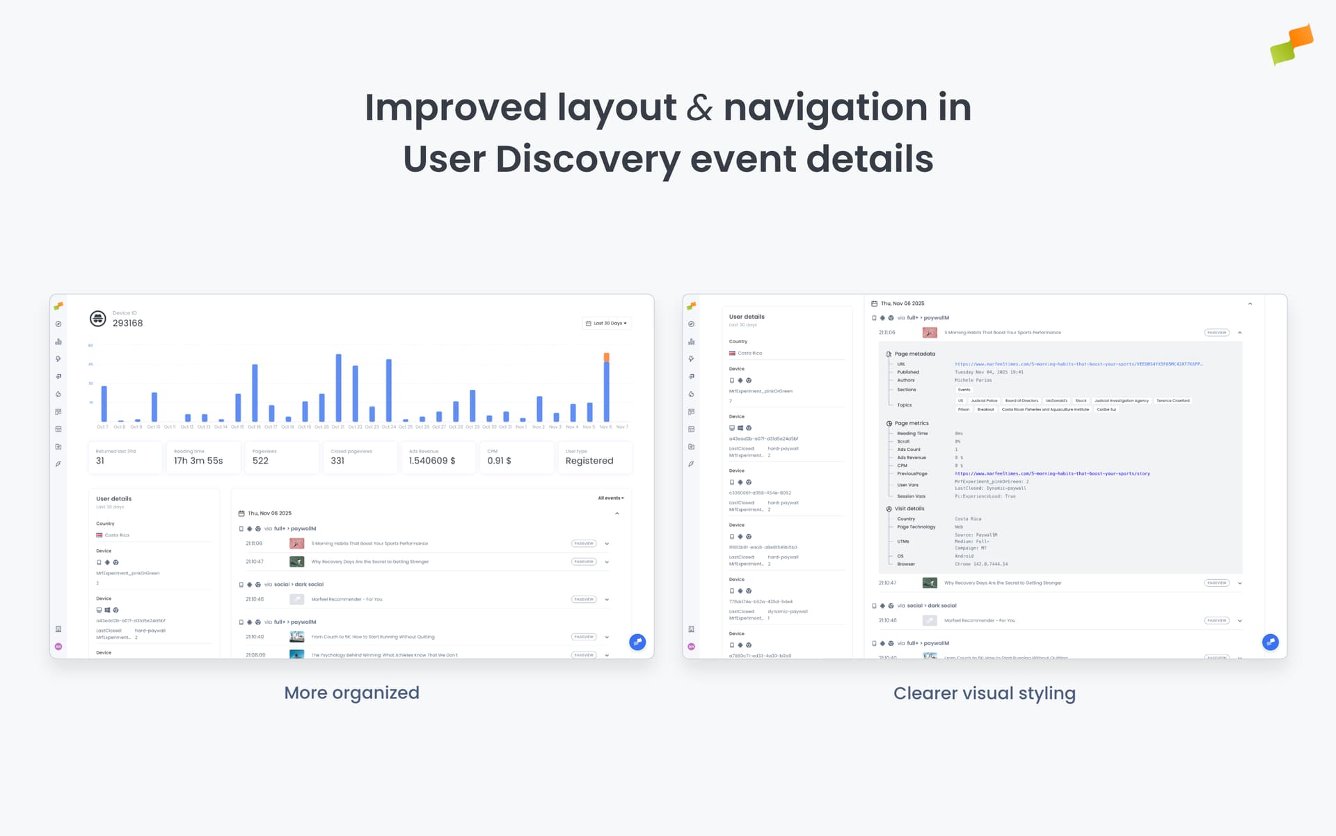 The User Discovery feature now displays event details in a more organized way with headers that stay visible while scrolling, making it easier to review user activity and understand the context of events. Event labels now have clearer visual styling to help distinguish between different types of user actions.