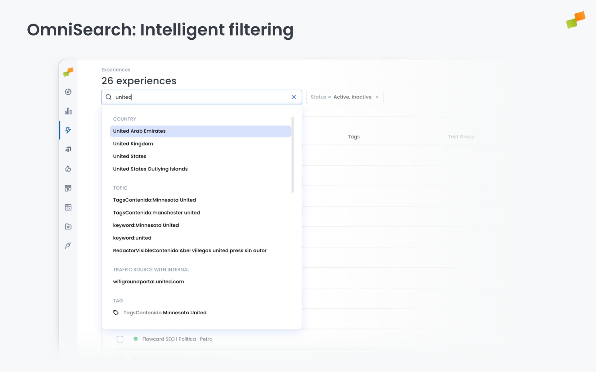 Type anything: Enter any search term — country names, experience names, tags, test groups, or other attributes.