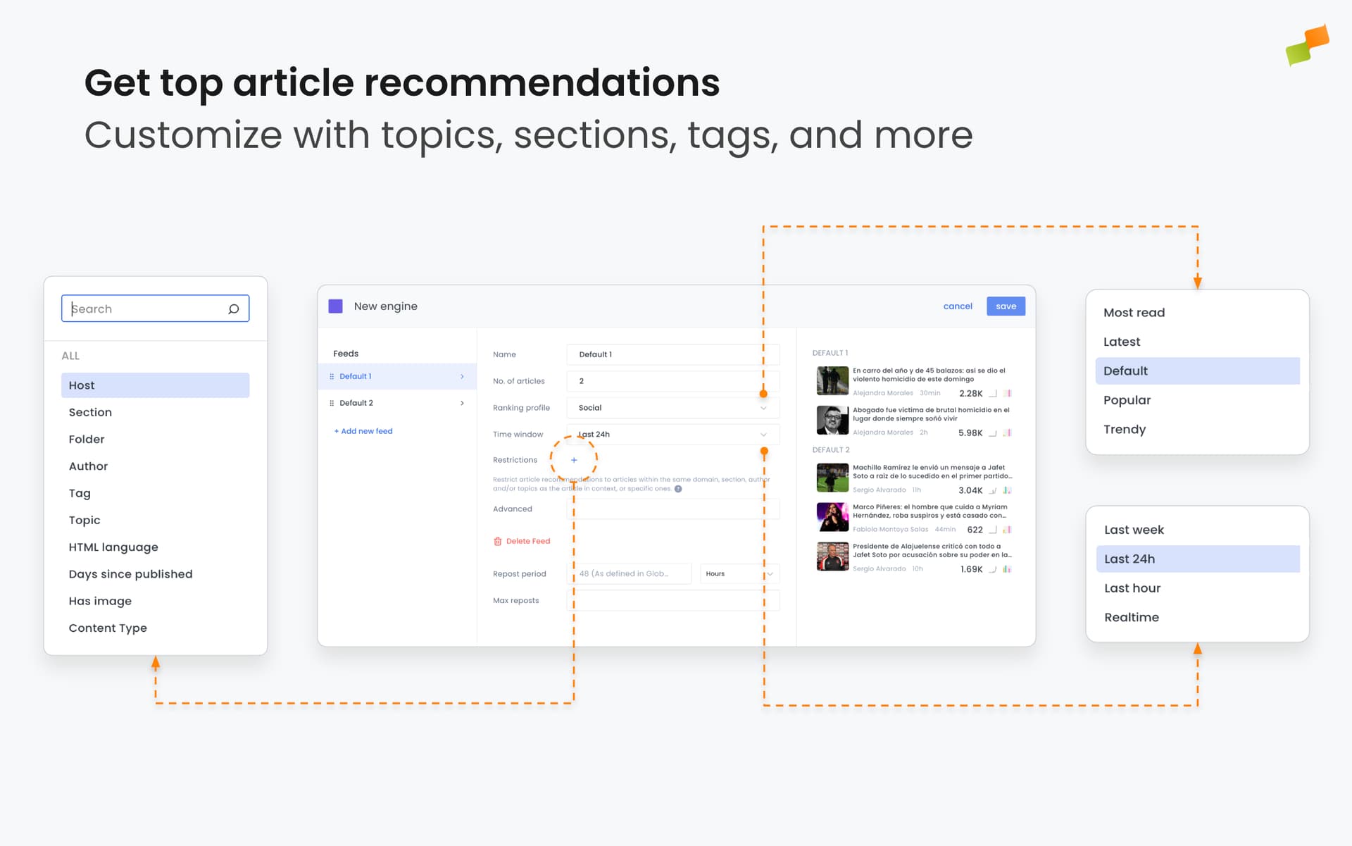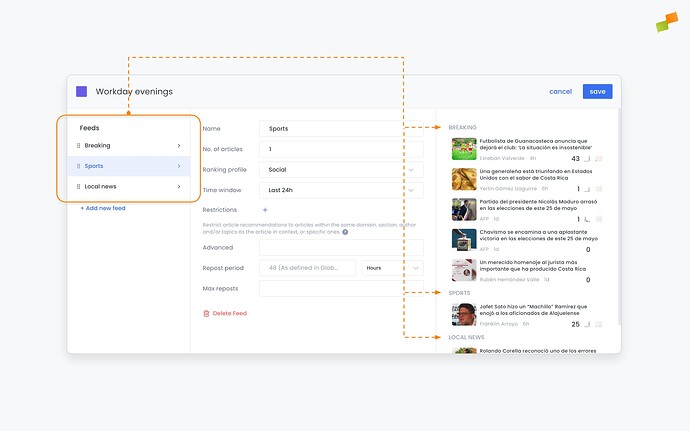 Recommenders can support complex use cases by configuring multiple feeds inside them. Each feed will return a number of articles that match the configured restrictions and sorted by its ranking profile.