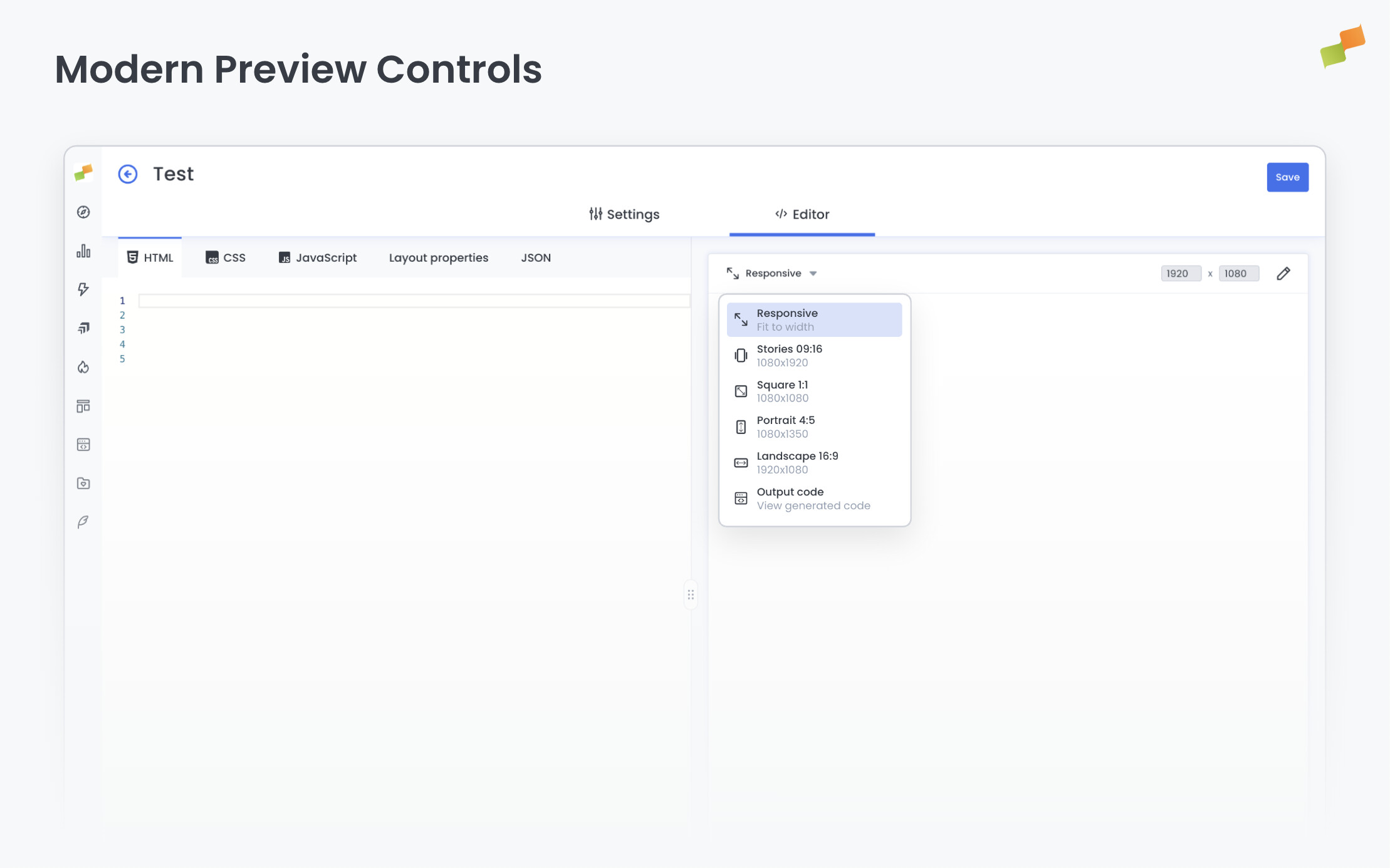 The most visible change is the new aspect ratio selector. Instead of icon-only buttons, a dropdown menu now shows each option with its label and exact dimensions: Stories 09:16 (1080x1920), Square 1:1 (1080x1080), Portrait 4:5 (1080x1350), Landscape 16:9 (1920x1080), and Responsive (fit to width). You see exactly what you’re choosing before you choose it.