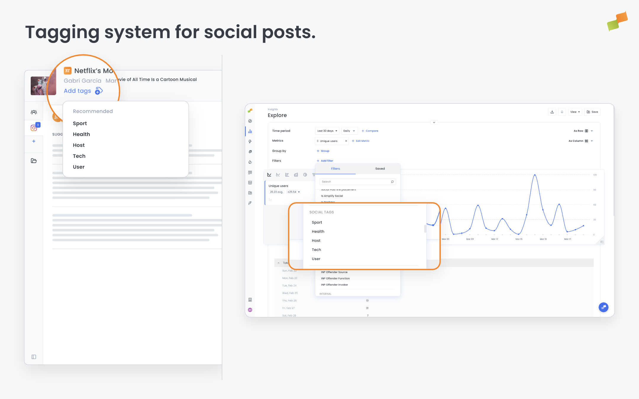 You can now tag every social post in Amplify and filter by those tags in Explore. That turns your posts into a structured dataset you can slice any way you need.